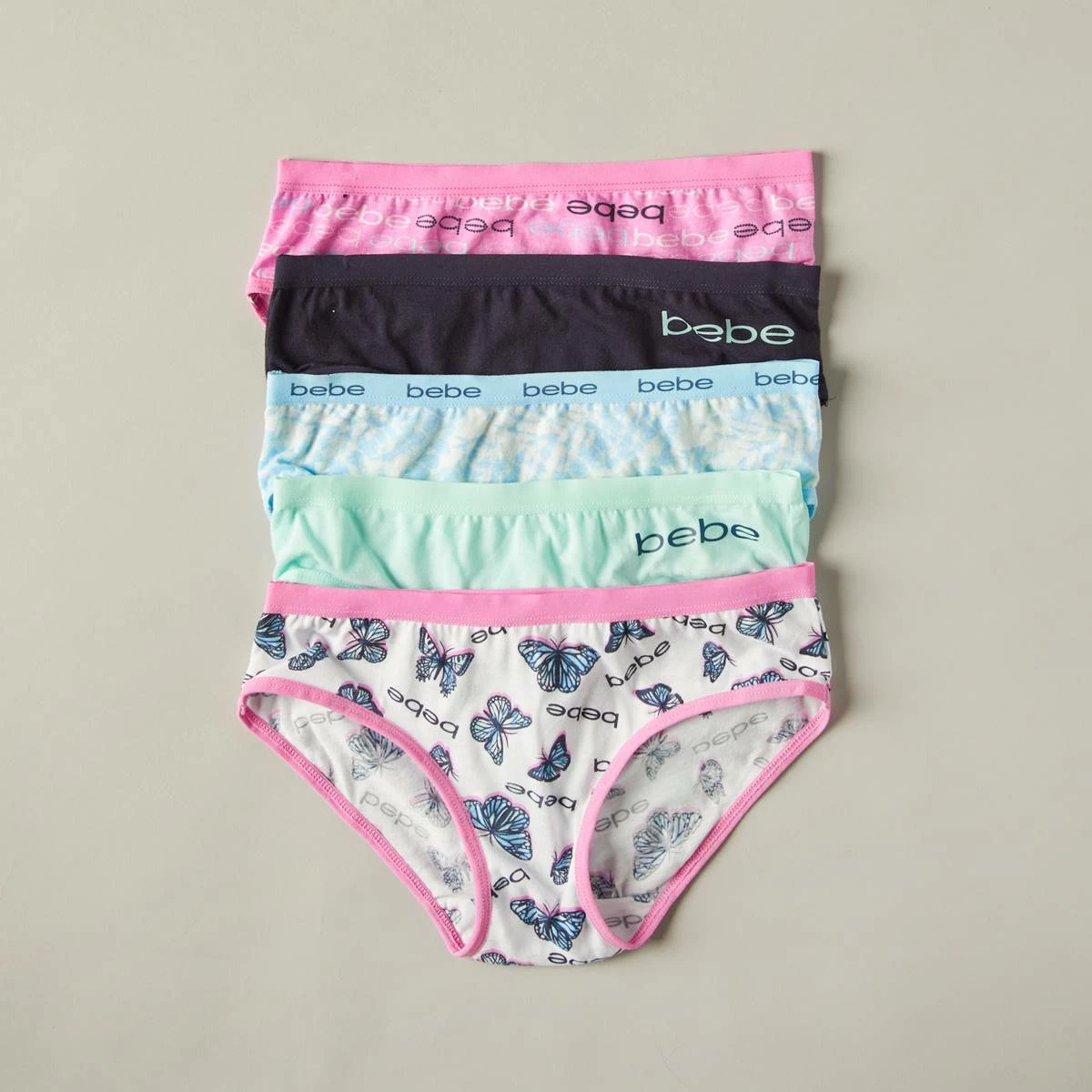 Upgrade her everyday basics with these comfy and soft Girls Bebe 5-pack of logo butterfly bikini underwear.
