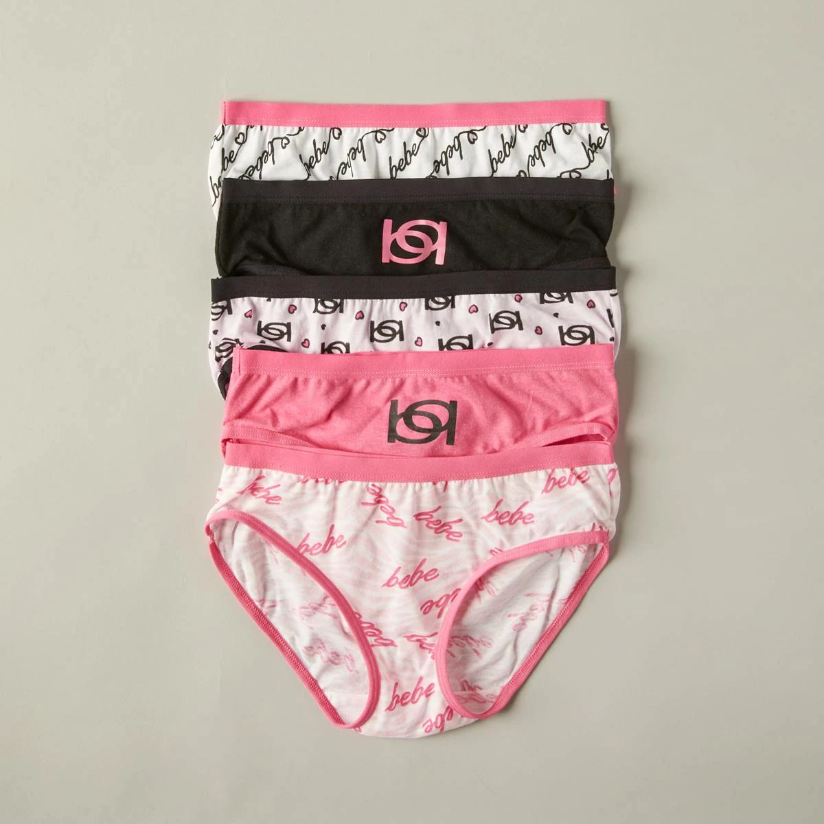 Upgrade her everyday basics with these comfy and soft Girls Bebe 5-pack of logo love bikini underwear.