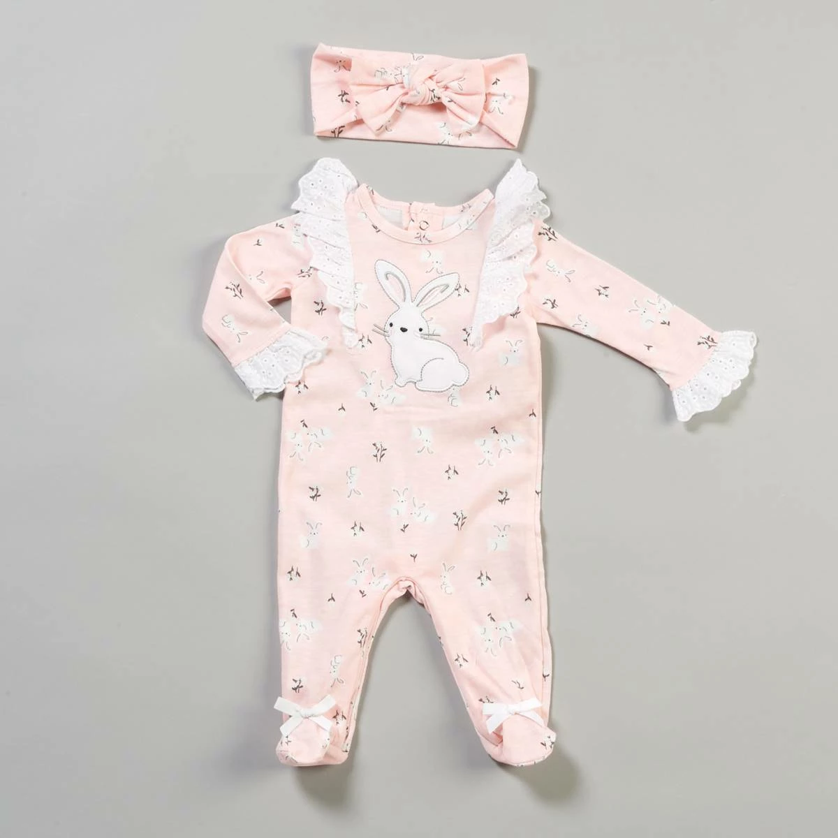 - Sleeper: snap-button back closure, ruffle accents on the shoulders and cuffs, built-in footies with bow details, bunny graphics, and floral pattern, fuzzy bunny applique