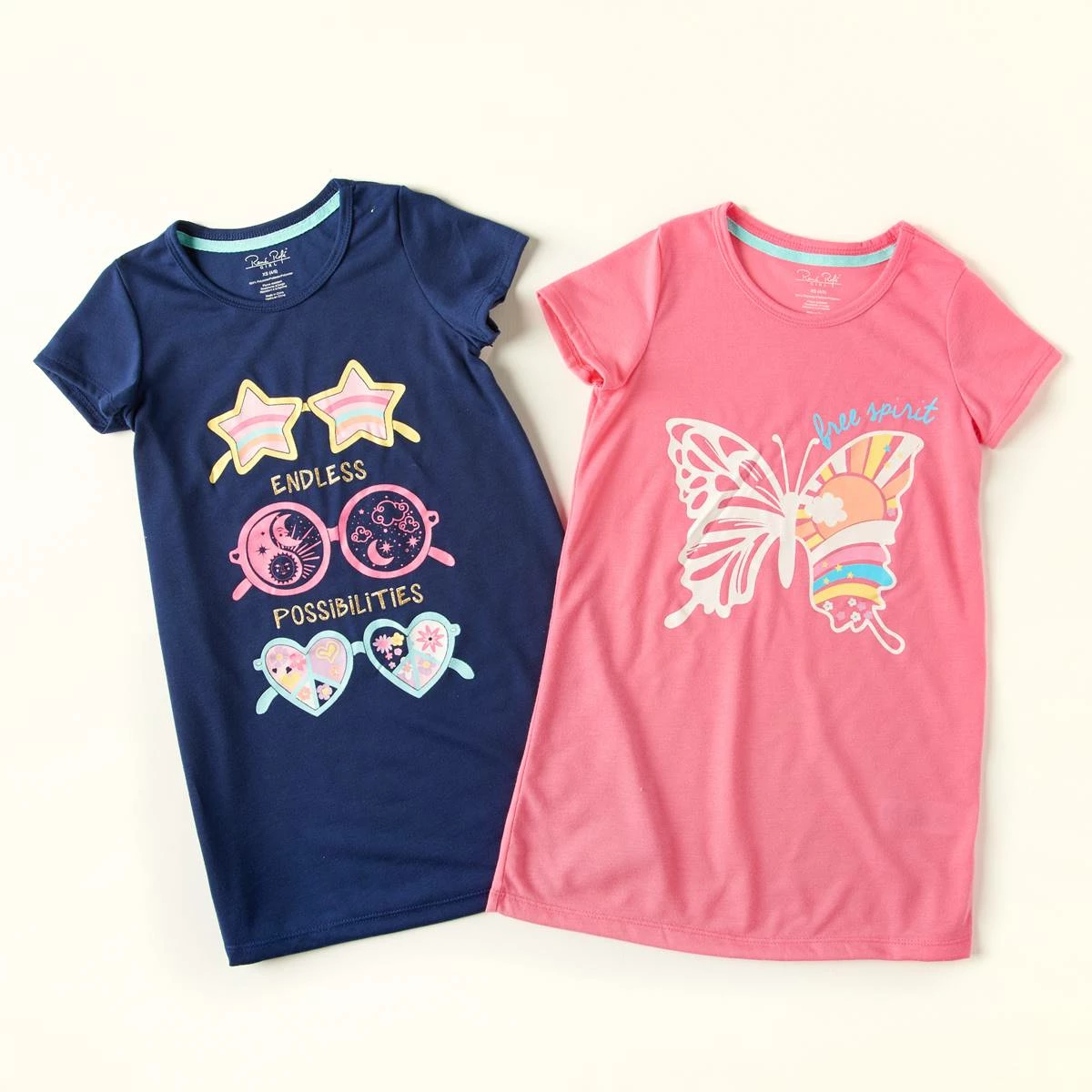 - Nightgown 2: short sleeves, “free spirit” script, butterfly graphic with rainbow, stars, and flower accents