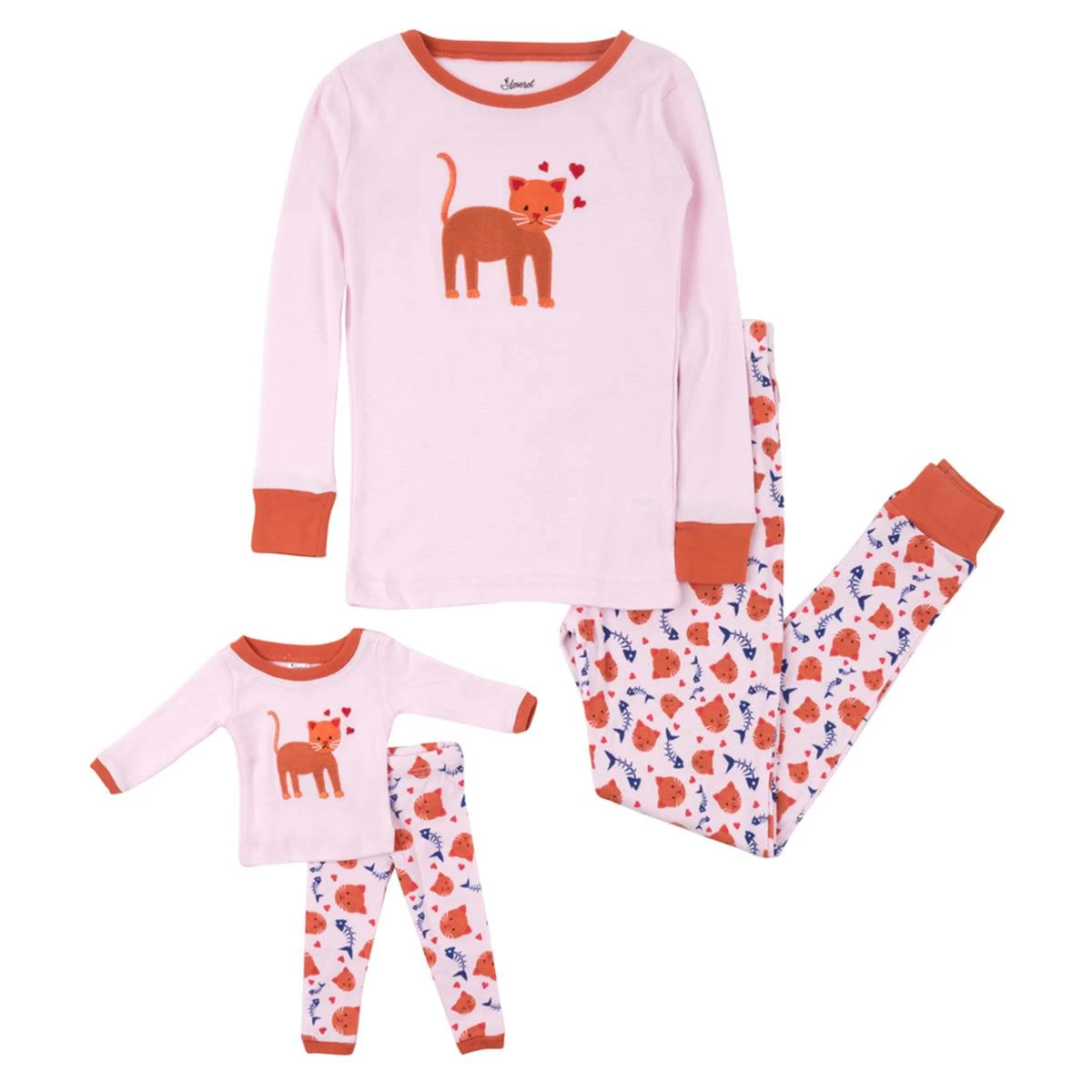 Your daughter will love matching her doll in this Girls Leveret pajama set. Featuring a kitten print on both your daughter’s pajamas and the matching doll pajamas.