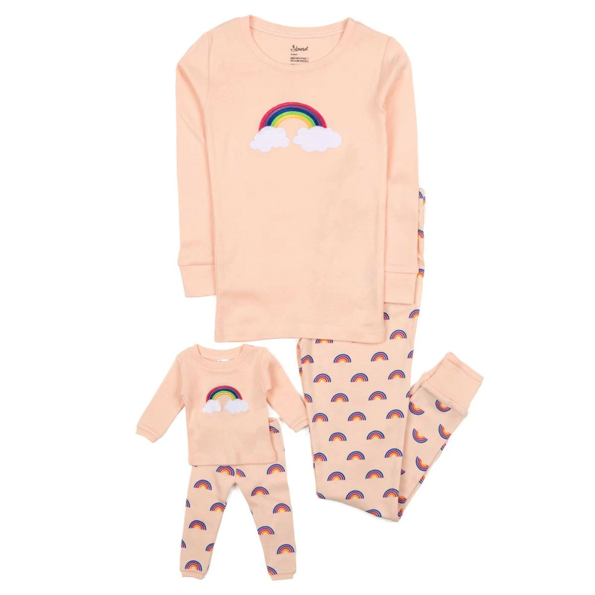 Your daughter will love matching her doll in this Girls Leveret pajama set. Featuring a rainbow print on both your daughter’s pajamas and the matching doll pajamas.