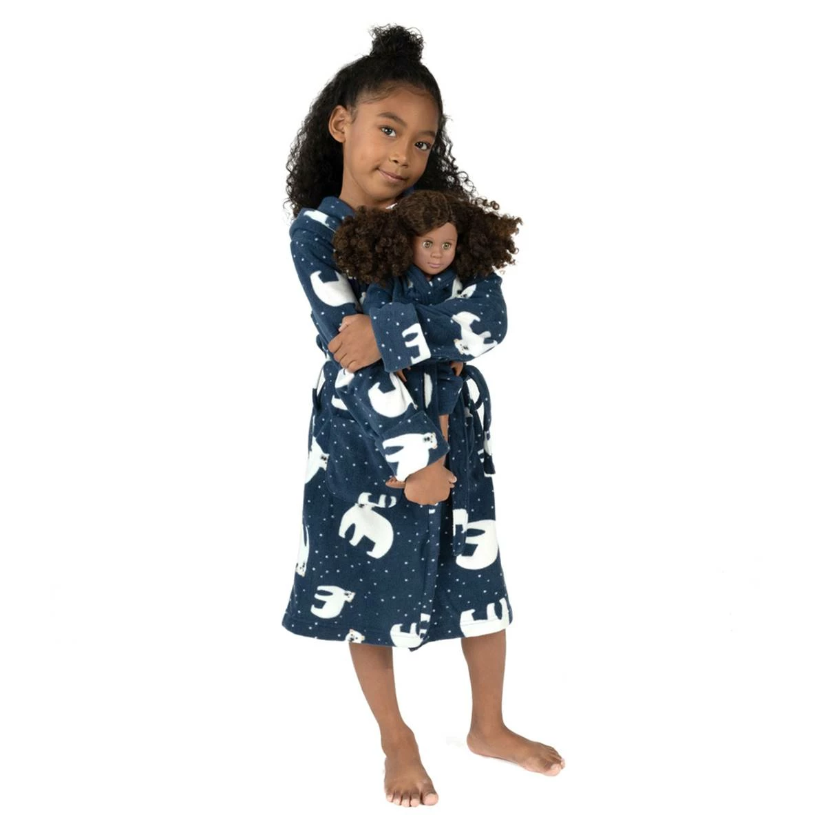 Your kids will love this Kids Leveret fleece robe. Featuring a tie waist, hood, and two convenient pockets made of a micro-fleece that is naturally flame resistant. The best part is there is a robe included for your child’s doll or stuffed animal.