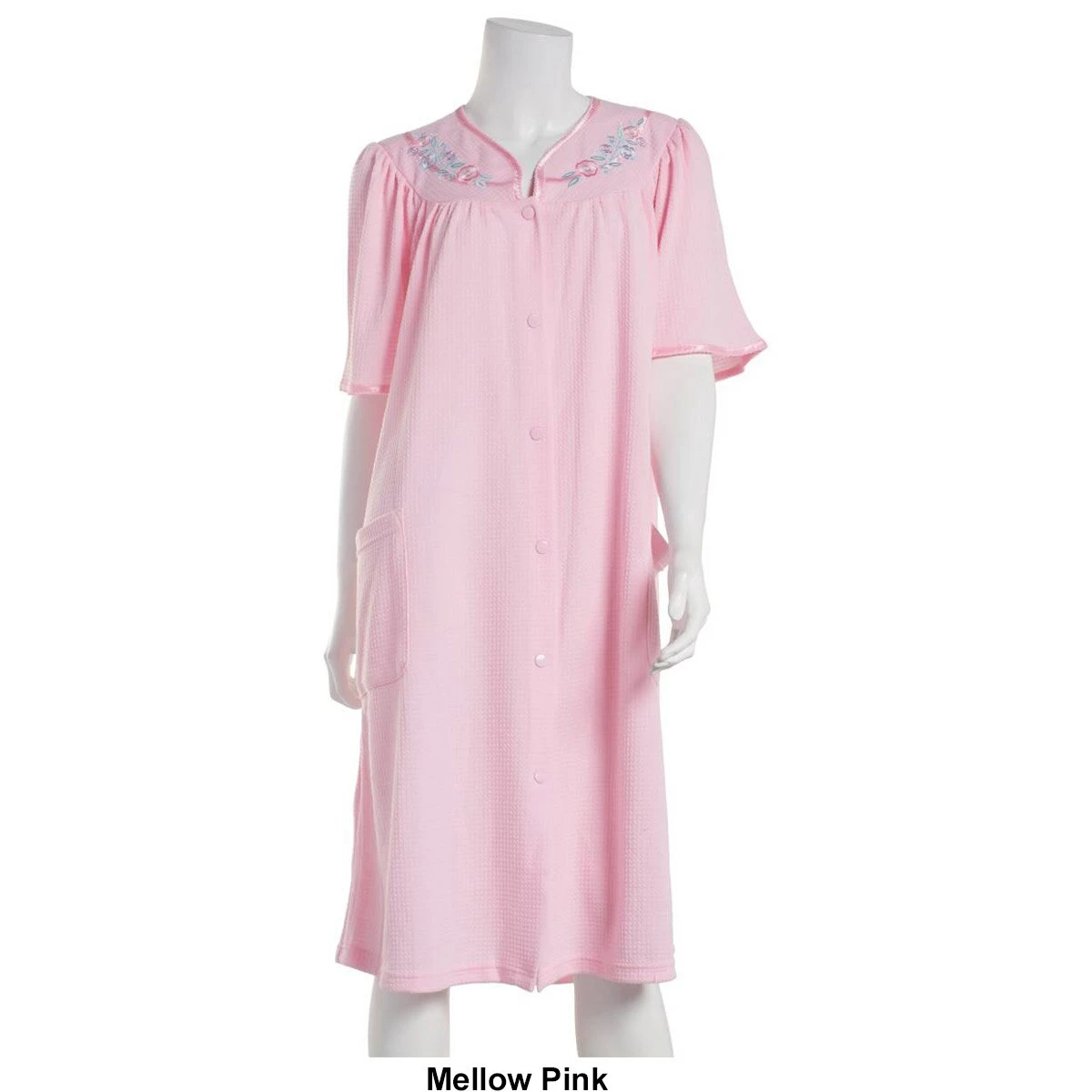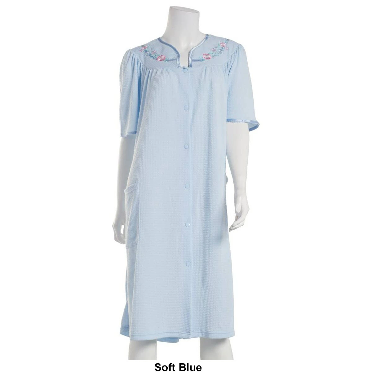 Complete your lounge look with the Petite Jasmine Rose short sleeve blister knit Trapunto snap robe. Providing snap up closure, floral embroidery, satin trim, and two exterior pockets.
