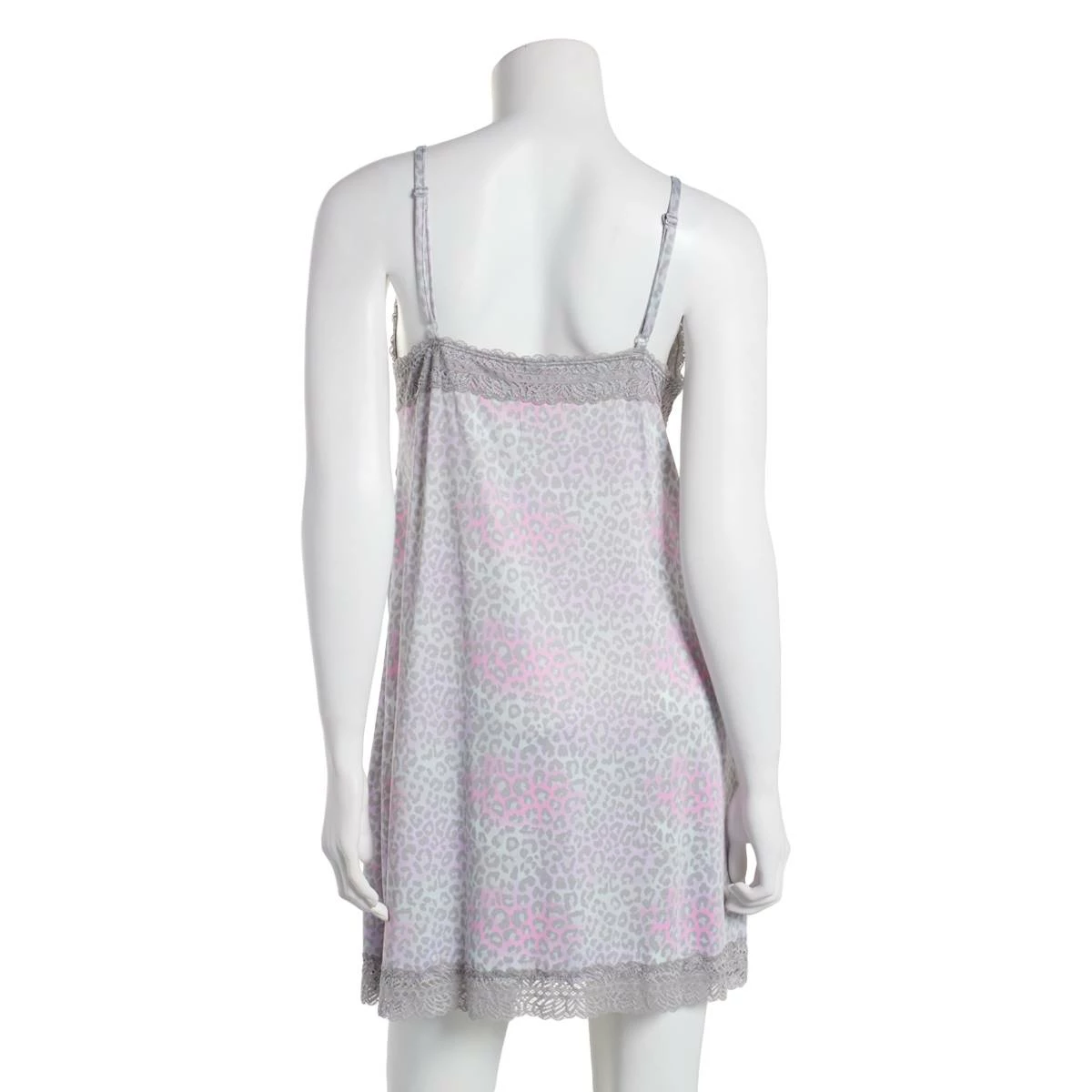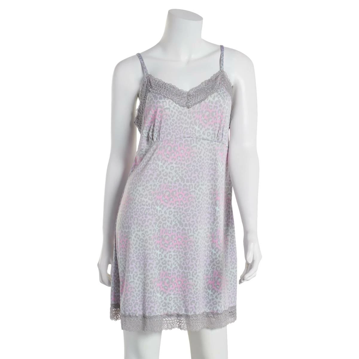 Relax in the Plus Jessica Simpson chemise. Featuring a fun soft colored leopard design, pretty lace detailing, and adjustable straps.