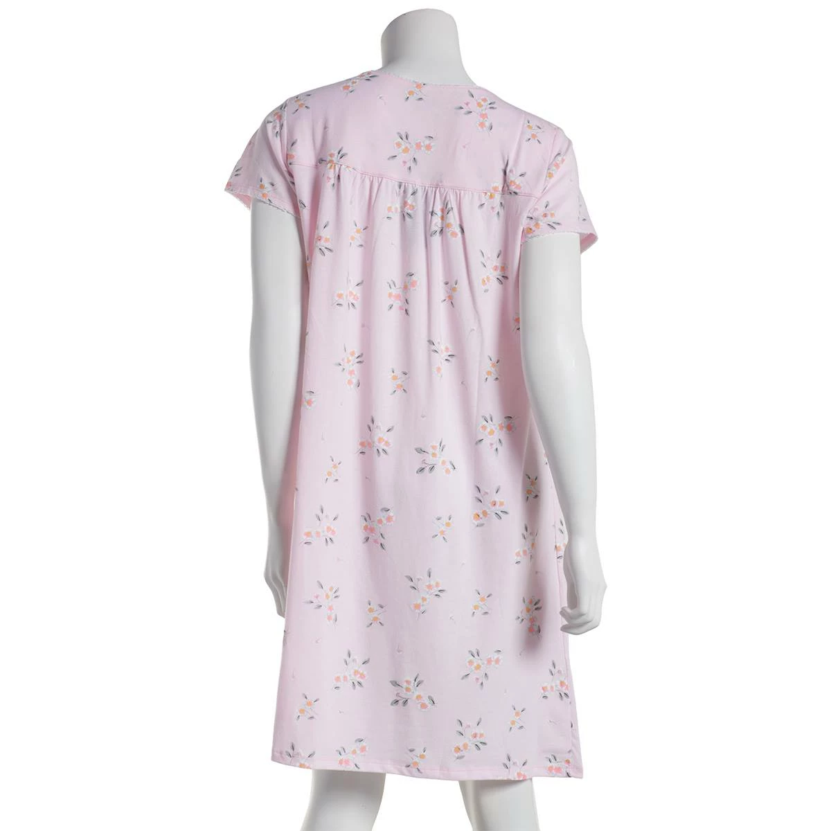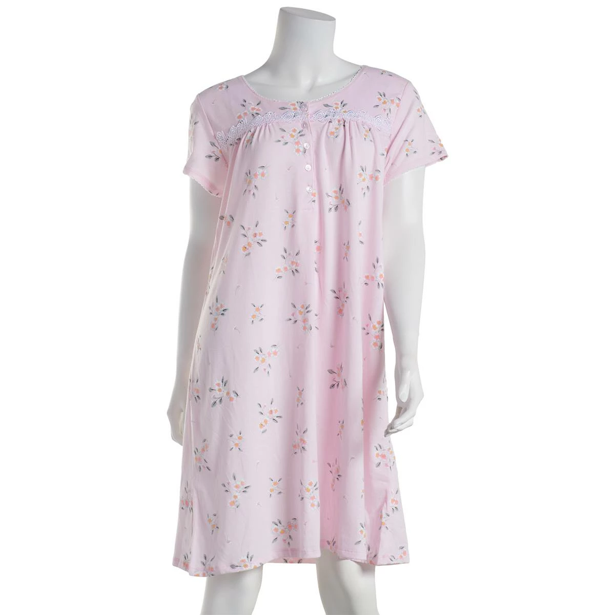 The Womens Aria short sleeve knit nightshirt includes a pretty floral design. Feel comfortable with stitch detailing around the neck and front, button-up closure, and lightweight design.