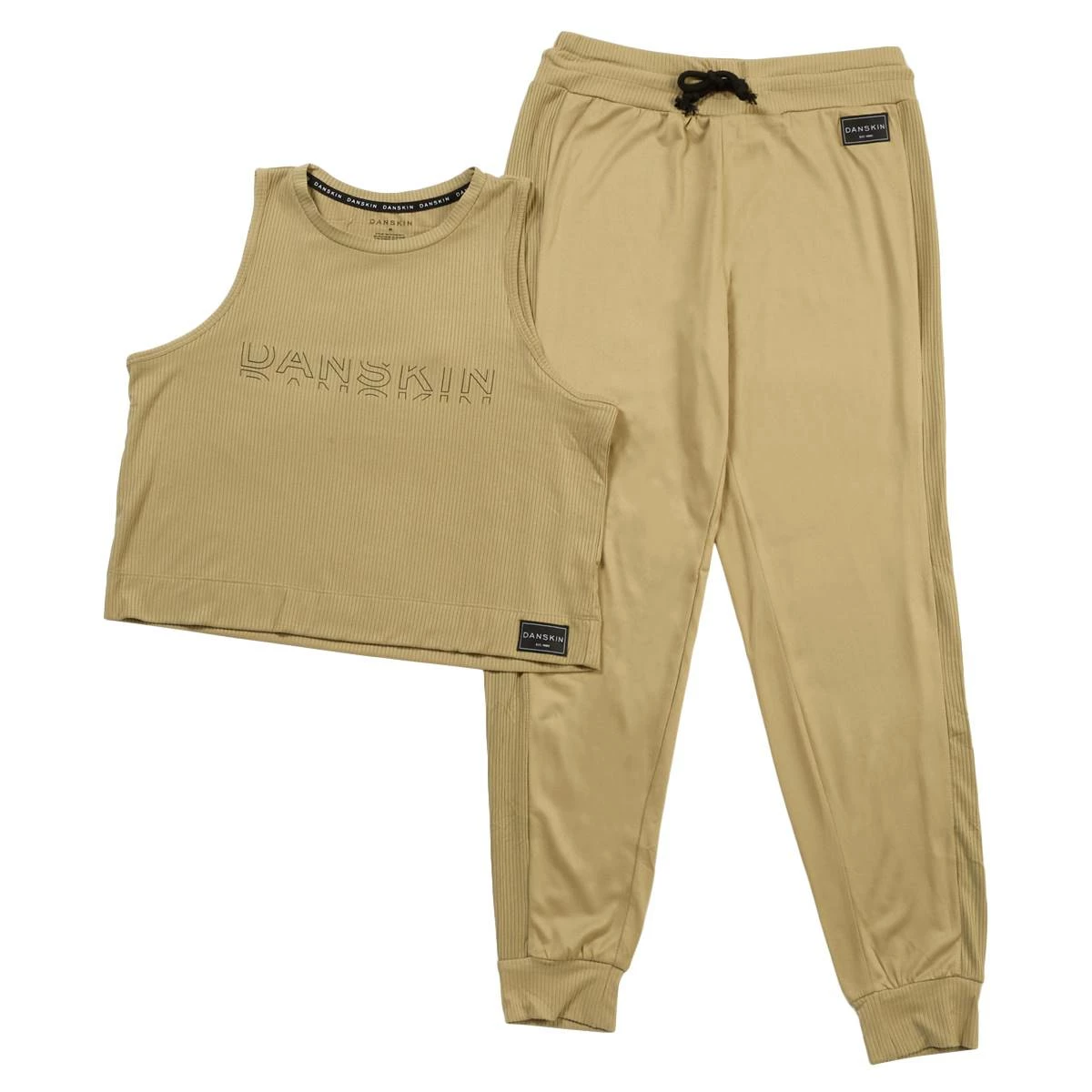 Kick your feet back and relax in the Womens Danskin rib high neck tank and joggers pajama set. Featuring a tank top with a signature logo and matching pajama pants with self tie around the waist.