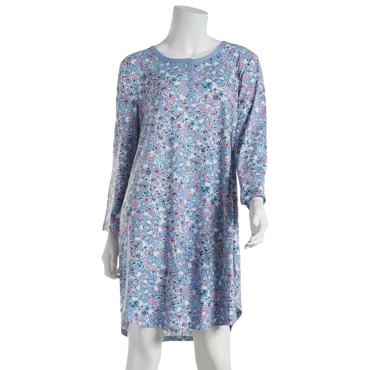 Enjoy your days off wearing the Womens Ellen Tracy 3/4 sleeve henley nightshirt. Including a snap front closure and a super soft material with floral design throughout.