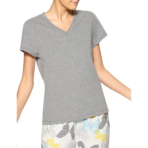 Womens HUE® solid pajama tee features short sleeves and a v-neck. 57% Cotton, 43% Polyester. Machine wash. Tumble dry.