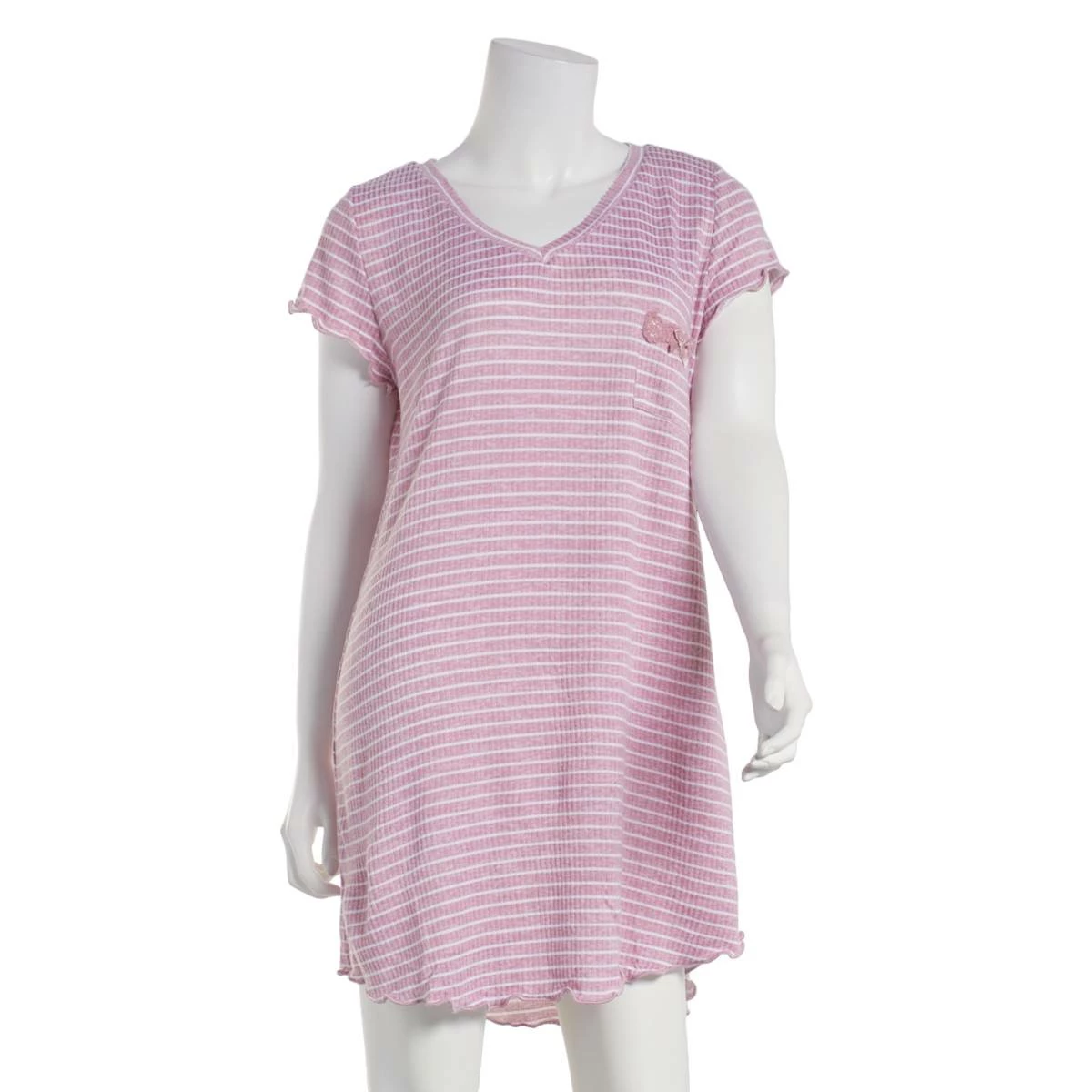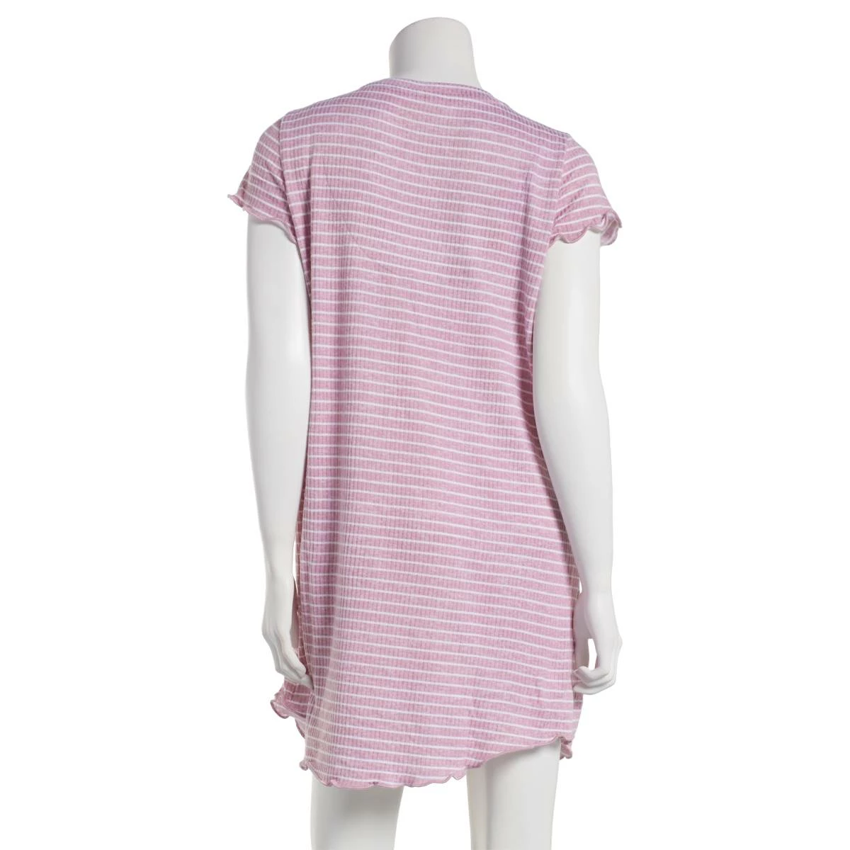 Relax in the Womens Laura Ashley® short sleeve hacci ribbed lettuce edge v-neck nightshirt. Featuring a stripe design, and a front pocket with bow detailing.