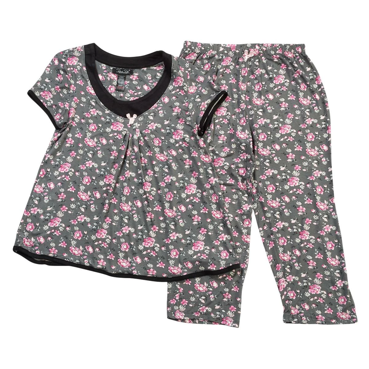 Rest up in the Womens René Rofé grey floral capri pajama set. This set comes with a short sleeve pajama top and a pair of matching capri length pajama bottoms with a pretty floral design throughout.