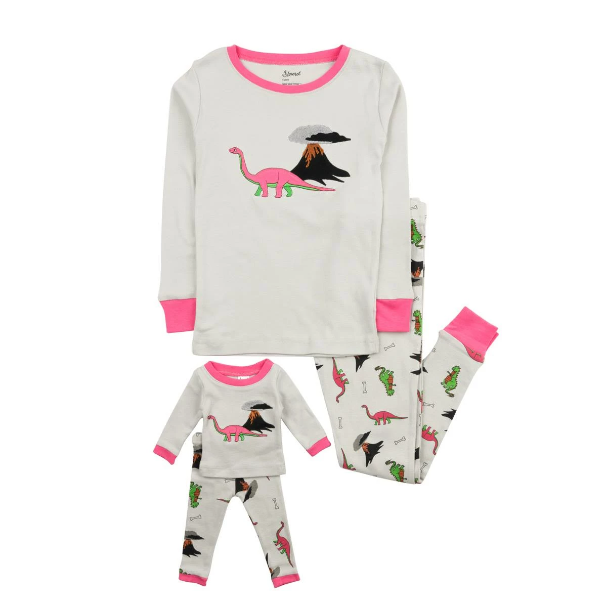 You’ll love these cute and comfy Toddler Girl Leveret Girl and Doll dinosaur print pajamas! These pajamas are made to be fitted. Keep your little ones happy in this long-sleeved pajama set.