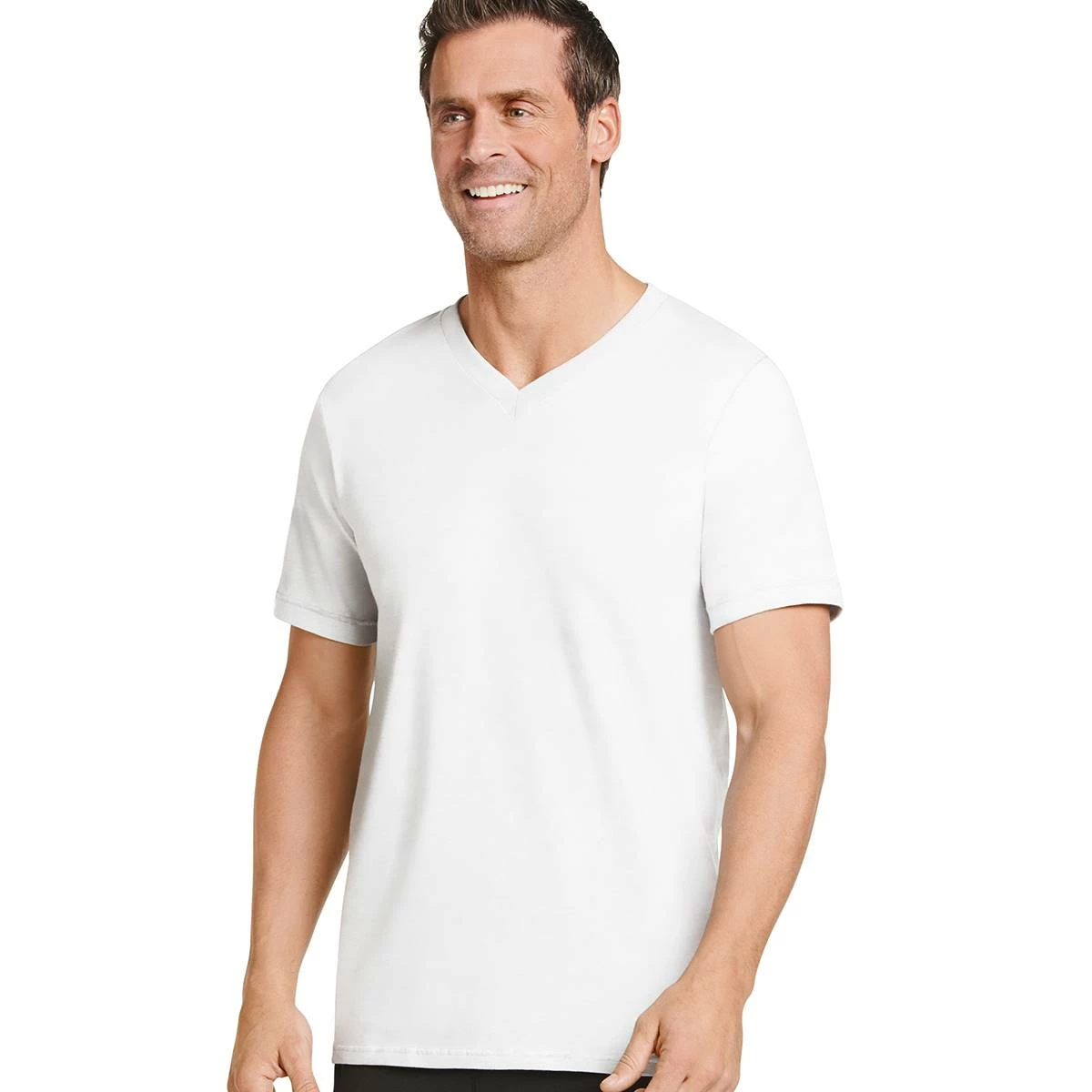 The Mens Jockey® Classic V-Neck men’s T-shirt is a comfortable classic with a reinforced collar and sweat-wicking fabric. STAYNEW® technology reduces pilling and fading while DIAMOND BRIGHT® technology helps keep whites looking whiter, wash after wash. A tag-free design eliminates irritation for all-day wear.