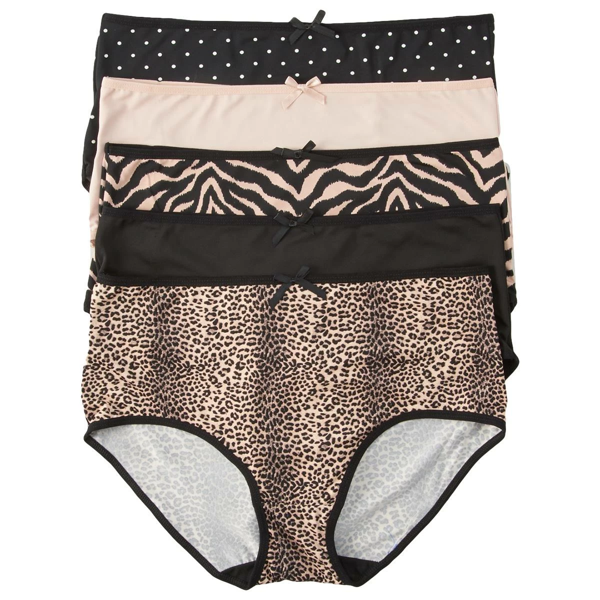 The Plus Size Delta Burke 5 pack full brief panties are a style that will drive your confidence levels. The chic design includes multiple prints with a bow detail.