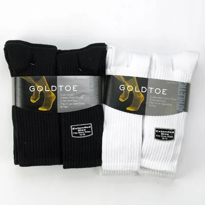 Mens Big & Tall Gold Toe® 6 pack of crew socks feature cushioned foot to absorb shock, reinforced toe for better fit, comfort and wear and soft, breathable fabric to keep feet cool and dry. 81% Cotton, 18% Nylon, 1%Spandex. Machine wash. Tumble dry.